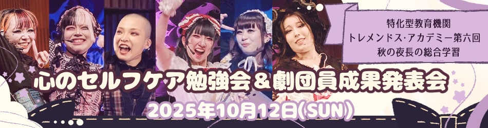 既報の通り、特化型教育機関 トレメンドス・アカデミー第六回 秋の夜長の総合学習『心のセルフケア勉強会&劇団員成果発表会』を開催いたします。 日時/2025年10月12日(日) 会場/新宿某所 主催/TremendousC …