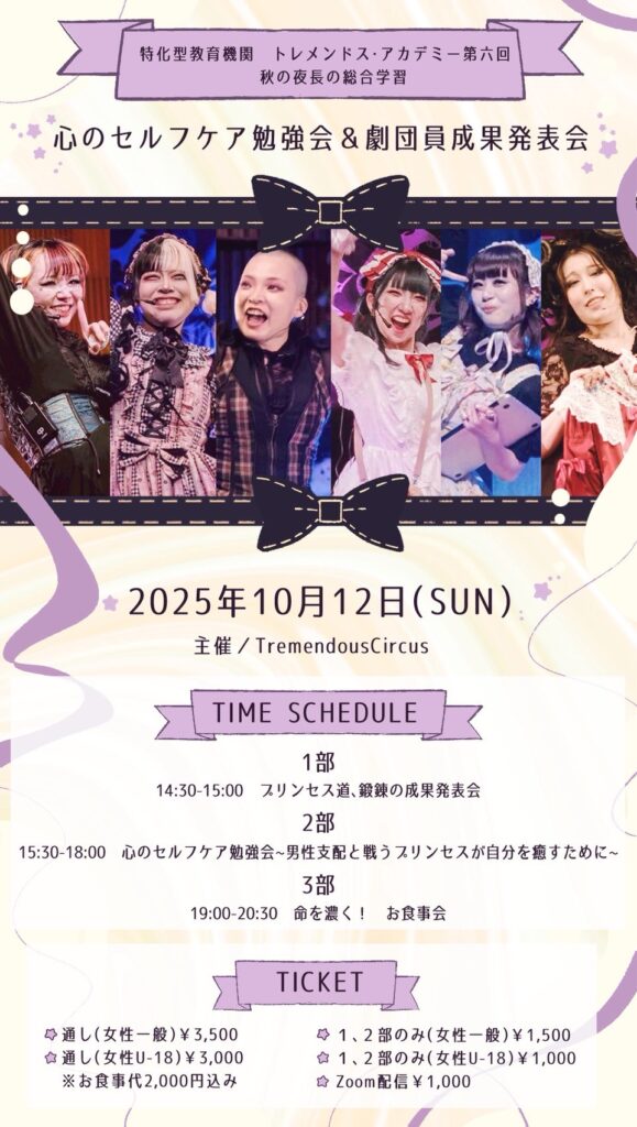 既報の通り、特化型教育機関 トレメンドス・アカデミー第六回 秋の夜長の総合学習『心のセルフケア勉強会&劇団員成果発表会』を開催いたします。